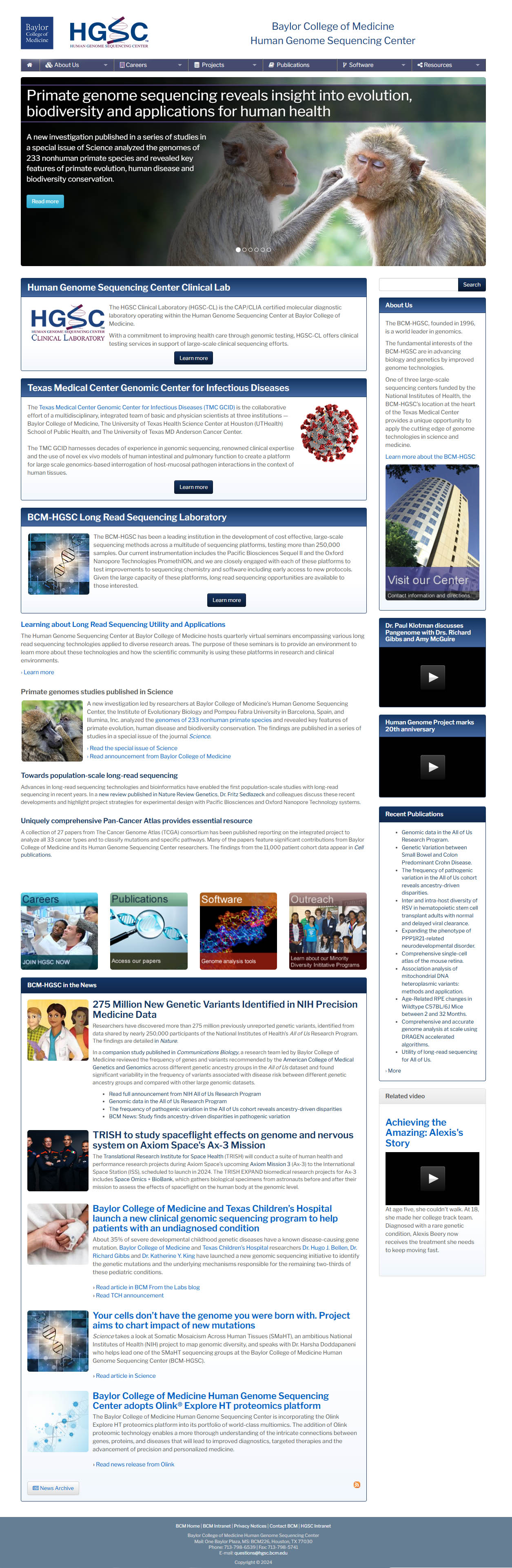 Built on a custom theme utilizing a responsive Bootstrap framework on Drupal, the Baylor College of Medicine Human Genome Sequencing Center website was the primary web presence for the Center. The website leveraged Drupal Views with the Biblio module and custom content types to provide public information about faculty, staff, projects and publications for the HGSC. The home page featured a rotating slider with stylized header and decorative fade-to-black gradient created through CSS.